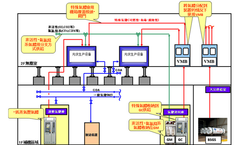 特種氣體是光電子、微電子等領(lǐng)域,特別是超大規(guī)模集成電路、液晶顯示器件、非晶硅薄膜太陽(yáng)能電池、半導(dǎo)體發(fā)光器件和半導(dǎo)體材料制造過(guò)程不可缺少的基礎(chǔ)性支撐源材料。它的純度和潔凈度直接影響到光電子、微電子元器件的質(zhì)量、集成度、特定技術(shù)指標(biāo)和成品率,并從根本上制約著電路和器件的精確性和準(zhǔn)確性。沃飛科技提供太陽(yáng)能光伏工廠所使用的高純度氣體(O2/Ar/N/H2/He等)、特氣(SiH4/GeH4/PH3/AsH3/SbH3/B2H6/BF3/NF3/PF3/PF5/CF5/CF4/C2H6/C3F8等)綜合供氣系統(tǒng);排氣處理、監(jiān)視系統(tǒng)的綜合管理系統(tǒng);建立以安全為第一的特氣管理輸送系統(tǒng)。從設(shè)計(jì)、選型、制造、安裝、測(cè)試、調(diào)試和系統(tǒng)托管服務(wù)