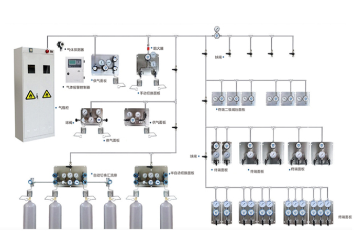 獨立氣瓶間:氫氣等易燃氣體需單獨設(shè)置氣瓶間,配備防爆電氣、通風系統(tǒng)(換氣次數(shù)≥3次/小時)及氣體泄漏報警裝置(氫氣報警閾值1%LEL)。
