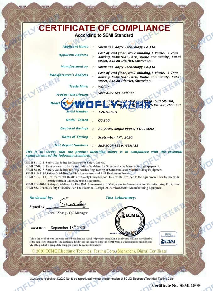 因特種氣體的特殊性,承載特種氣體的氣瓶柜體須為防爆柜體,同時(shí)為保證半導(dǎo)體制程工藝中特種氣體的穩(wěn)定供氣和安全,應(yīng)具備多種功能,如柜內(nèi)氣體泄漏偵測報(bào)警、PLC面板控制、全自動(dòng)吹掃等,提高使用安全系數(shù),有效的保護(hù)生產(chǎn)安全和人員的生命安全。其次,半導(dǎo)體行業(yè)配置電子特氣柜需要擁有SEMI S2認(rèn)證。