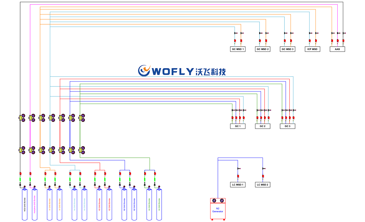 實驗室集中供氣系統(tǒng),是將各種實驗分析儀器需要使用的各類氣體鋼瓶,全部放置在實驗室以外獨立的氣瓶間內(nèi),進行集中管理,各類氣體從氣瓶間以管道輸送形式,按照不同實驗儀器的用氣要求輸送到每個實驗室不同的實驗儀器上。